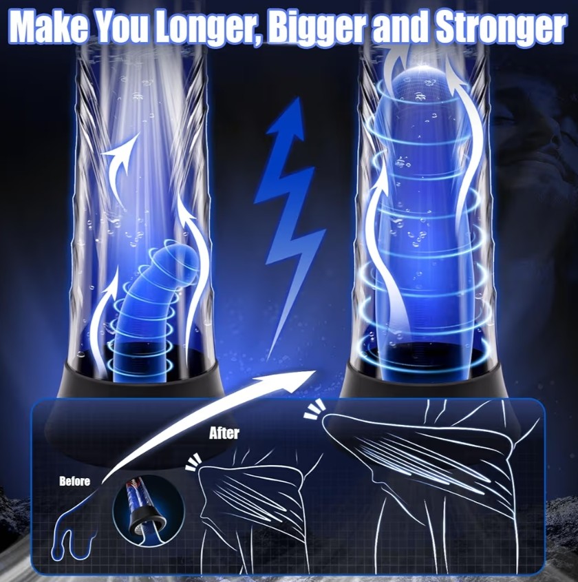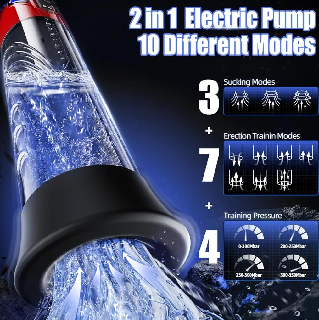 [2 in 1 Electric Penis Pump ] This 2 in 1 penis pump is combined automatic male masturbatior cup and cock erection trainer. You can not only use it as a male masturbatior to enjoy this toy, but also you can use this vacuum pump to train your penis, which will make you bigger, longer and stronger.