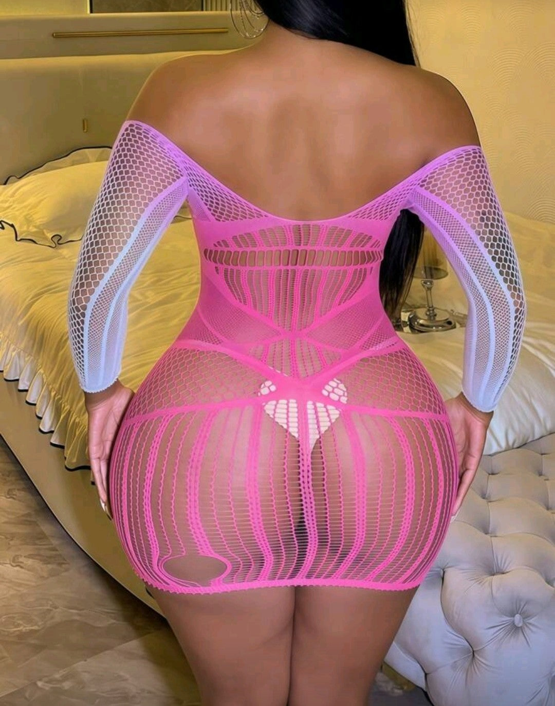 Sexy Mesh Hollow Pink & White Off Shoulder Dress. One size fits most. Undergarments NOT included