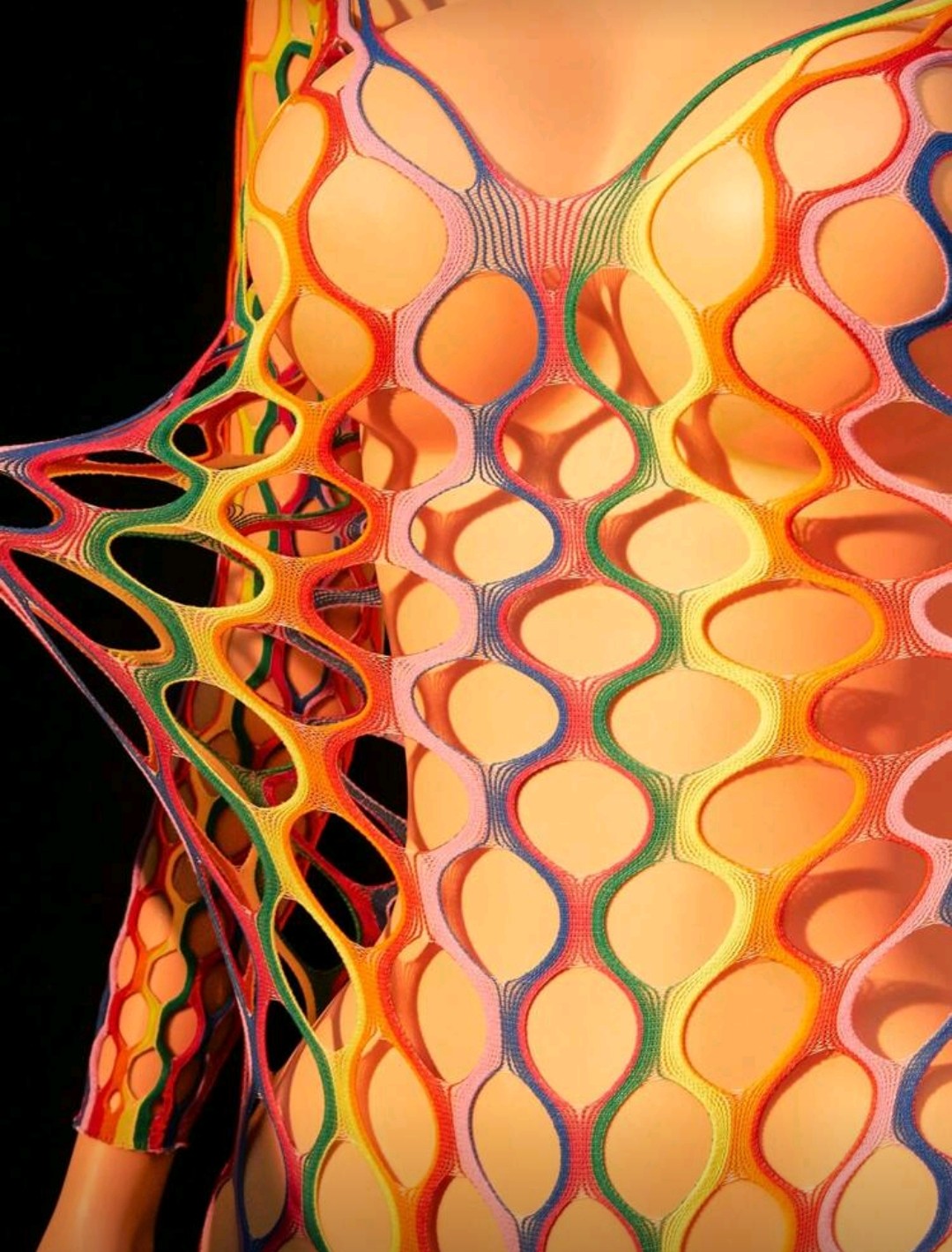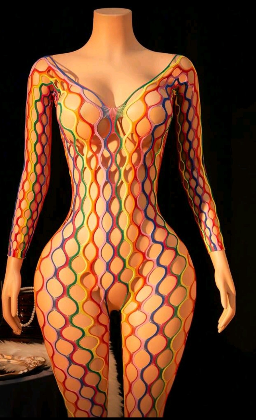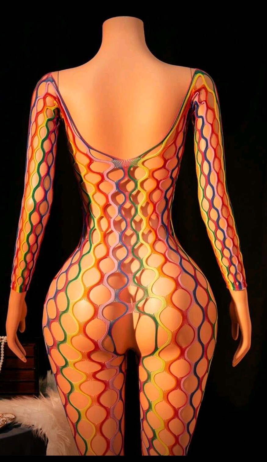 1PC Fishnet Rainbow Exotic Lingerie See Though Mesh Bodycon Colorful Stripes Bodystocking